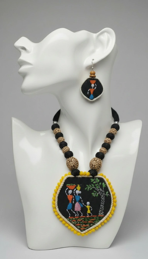 Made from high-quality KANTHA STITCH finished with earthy tones, the set showcases detailed hand-painted tribal figures, giving it a unique and authentic look. The elongated beads and structured pendant create a striking silhouette, perfect for ethnic wear, sarees, or fusion outfits.