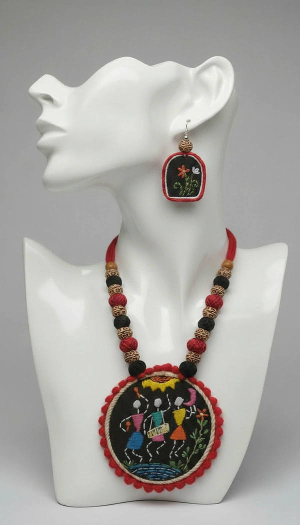 Made from high-quality KANTHA STITCH finished with earthy tones, the set showcases detailed hand-painted tribal figures, giving it a unique and authentic look. The elongated beads and structured pendant create a striking silhouette, perfect for ethnic wear, sarees, or fusion outfits.