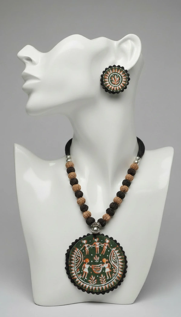 Made from high-quality KANTHA STITCH finished with earthy tones, the set showcases detailed hand-painted tribal figures, giving it a unique and authentic look. The elongated beads and structured pendant create a striking silhouette, perfect for ethnic wear, sarees, or fusion outfits.