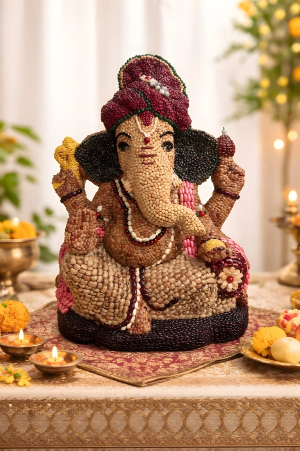 Bring divine blessings and artistic elegance into your home with this beautifully handcrafted Lord Ganesha idol made from natural grains and seeds. Intricately designed using assorted pulses, grains, and decorative elements, this unique Ganpati statue showcases remarkable craftsmanship and traditional Indian artistry.