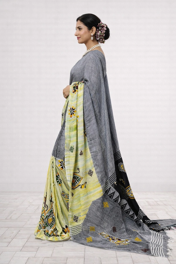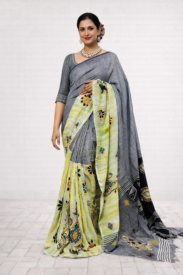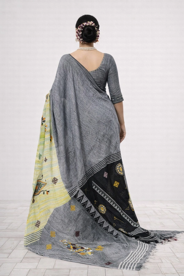 Discover premium Khadi fabric featuring traditional Kathiawari and Gujarati hand work, beautifully enhanced with hand brush painting. Soft, breathable, and handcrafted by skilled artisans, this fabric blends heritage embroidery with artistic detailing. Perfect for ethnic wear, festive outfits, and unique designer creations.