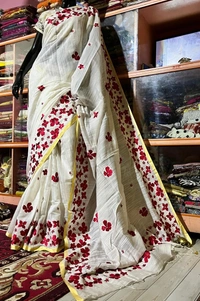 The delicate embroidery adds a touch of sophistication and artistic detail, making it suitable for both subtle festive occasions and everyday elegance. Its lightweight nature and effortless drape make it ideal for long hours of wear without compromising on style.